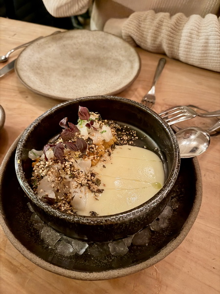 第二道上桌的是北海道干貝,生干貝加入綿密的南瓜、柚子以及海苔,旁邊淋上醬汁,上面再撒上紫蘇葉,干貝的份量十足整體還不錯。