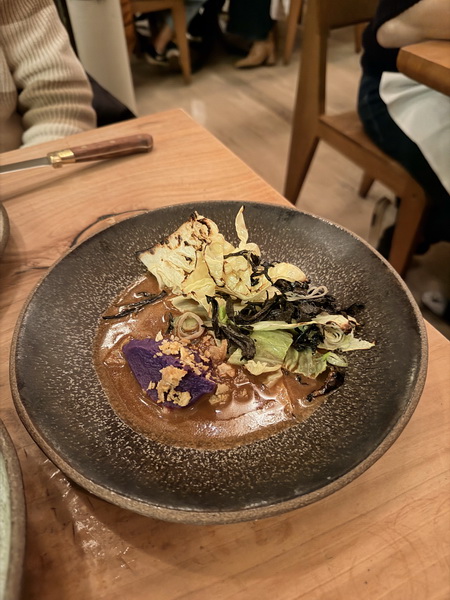 這道是服務生推薦的菜色之一,海帶做成的麵條搭配秀珍菇,淋上番茄羽衣甘藍高湯以及柴魚片。