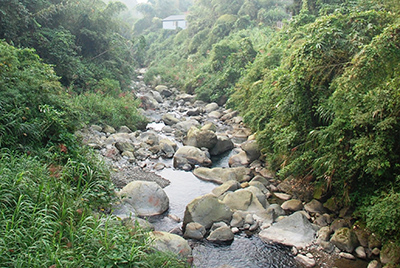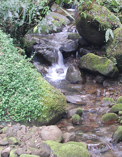 翠虹橋高高地吊在山澗之上。多年沒有走過吊橋,與一群同是來自加州的團友們走上橋面,橋身搖搖晃晃地,那感覺很令人興奮。很喜歡走吊橋的滋味,有種返璞歸真的喜悅感。不是雨季,水量不大,橋下潺潺溪水不疾不徐,緩緩地流過山澗。溪中亂石崢嶸,溪水自岩石上層層疊疊往下流,濺起朵朵小水花,形成的迷你瀑布別有一番趣味。溪畔青苔碧草,芒花迎風飄搖,一派林泉清趣。所謂「上善若水,水善利萬物而不爭」,站在橋上凝視清徹流水,環看滿眼青翠,突然領會到什麼是「似水柔情」。