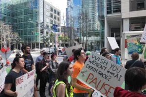 週六在San Francisco,數十名抗議者聚集在Anthropic總部外,呼籲大型人工智慧公司暫時停止開發前沿人工智慧系統。