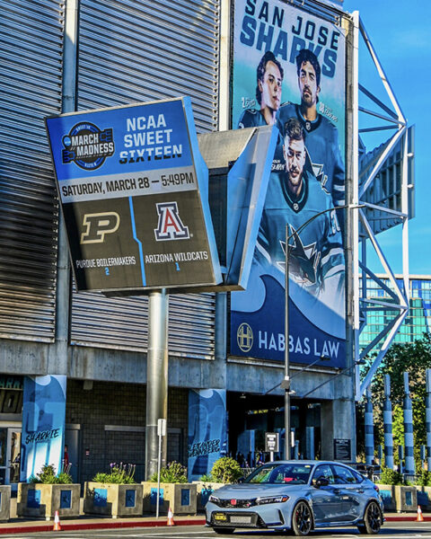 作品描述:  2026年NCAA Sweet Sixteen 與 Elite Eight 西區賽事於聖荷西舉行。 藍天之下,場館外牆與巨幅賽事看板矗立街頭,車流穿梭其間,勾勒出賽事來臨前蓄勢待發的城市節奏。