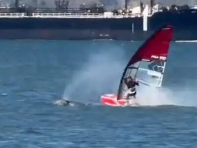 一起極為罕見的交通事故發生在San Francisco海灣裡,KRON4.com取得的一段影片顯示,在一個風和日麗的大白天中,一位帆板衝浪者在海灣中與一頭鯨魚相撞。