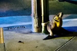 週四淩晨,一只加州海獅幼崽在San Francisco街頭遊蕩。