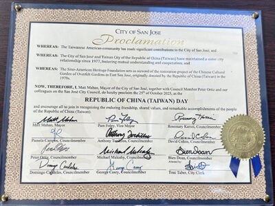 San Jose頒「中華民國臺灣日」賀狀表彰